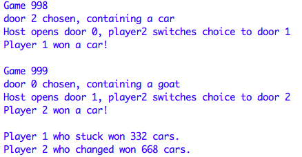 I decided that I’d have two players who both pick the SAME random door in each game; player 1 would stick and player 2 would always change their choice having been ‘shown’ the door with the goat. If the car is always behind the last door, I think the sequence works like this…