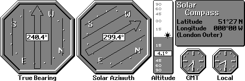 Although this only works in sunny weather when the sun is over the horizon... it could be handy if you lose, break or forget the magnetic compass! You can feed in the bearing of a satellite, align the Solar Azimuth arrow with the sun's shadow and the other dial will point to the satellite.