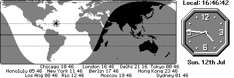 Geoclock program shows sun's current position, night and day and constantly updated world times.