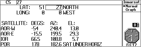 feed in your latitude and longitude and this spreadsheet gives you the azimuth and elevation of the 4 Inmarsat-B satellites. This enables you to perform these vital calcluations without having to rig and find power for the Marconi Inmarsat unit.