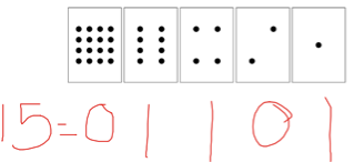 I then asked the children what the smallest number is we could encode using 5 cards (0), and the largest (31). I then asked if there were any numbers between 0 and 31 we could not encode this way. Children had various ideas: 19, 13. We continued the investigation and established that you can show any number like this. We then talked about why this is important for computers: if you order 19 pencils, or your test score is 13/15, you want the computer to be able to remember any number.