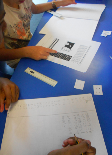 This began our investigation of binary maths, using the ‘Binary Numbers’ activity on p4/5 of the excellent Computer Science Unplugged.