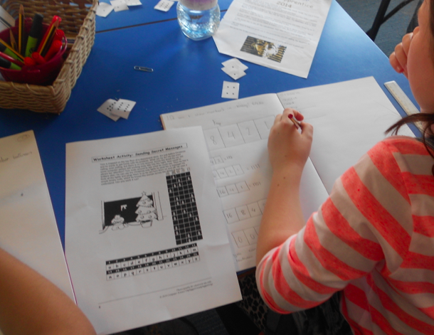 Children then made up their own codes for partners to read, using the same system. Here an accusation of ‘cheating’ was used as a starting point for a discussion about espionage and intelligence. The Enigma codes were broken because a machine was stolen, and because sometimes operators were careless, sending the same message more than once, or even sending it unencoded (in ‘plaintext’). If you’re writing a secret message, you had better destroy the original – or better still, don’t write it down at all.