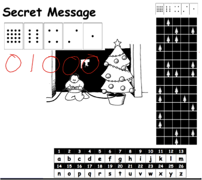 This combined what we’d learned about binary numbers with code-breaking skills (linking back to WW2 and the importance of the work at Bletchley Park in winning the war). As soon as children noticed that the first letter was ‘H’ they deduced from the context that the first word was probably ‘help’. Children then noticed the rows where no lights were on, and deduced this probably meant a space, so the 1st word had 4 letters and therefore was even more likely to be ‘help’. We talked about how context, knowledge of likely content of messages (such as weather reports) and spotting patterns were the same skills used by code-breakers in WW2.