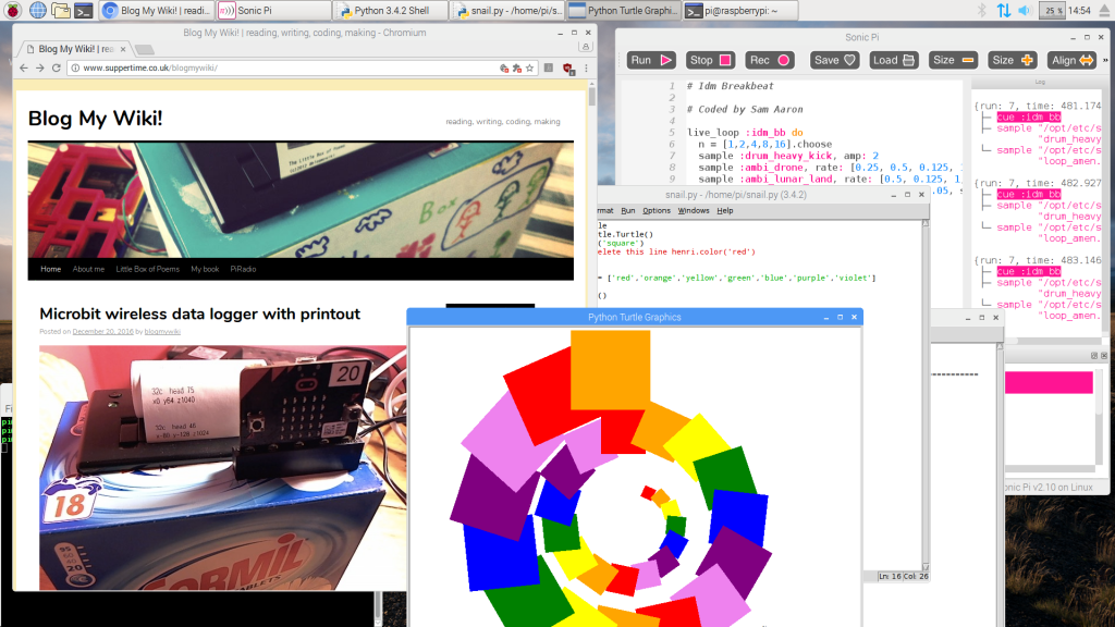 The picture shows me simultaneously web-browsing, playing music in Sonic Pi out of the SoundBlaster card, drawing a Matisse snail in Python – and of course doing a screen-shot using scrot. The picture quality on my old Sony TV is amazingly good – luckily I had a DVI to HDMI cable lying around as my TV only has HDMI inputs.