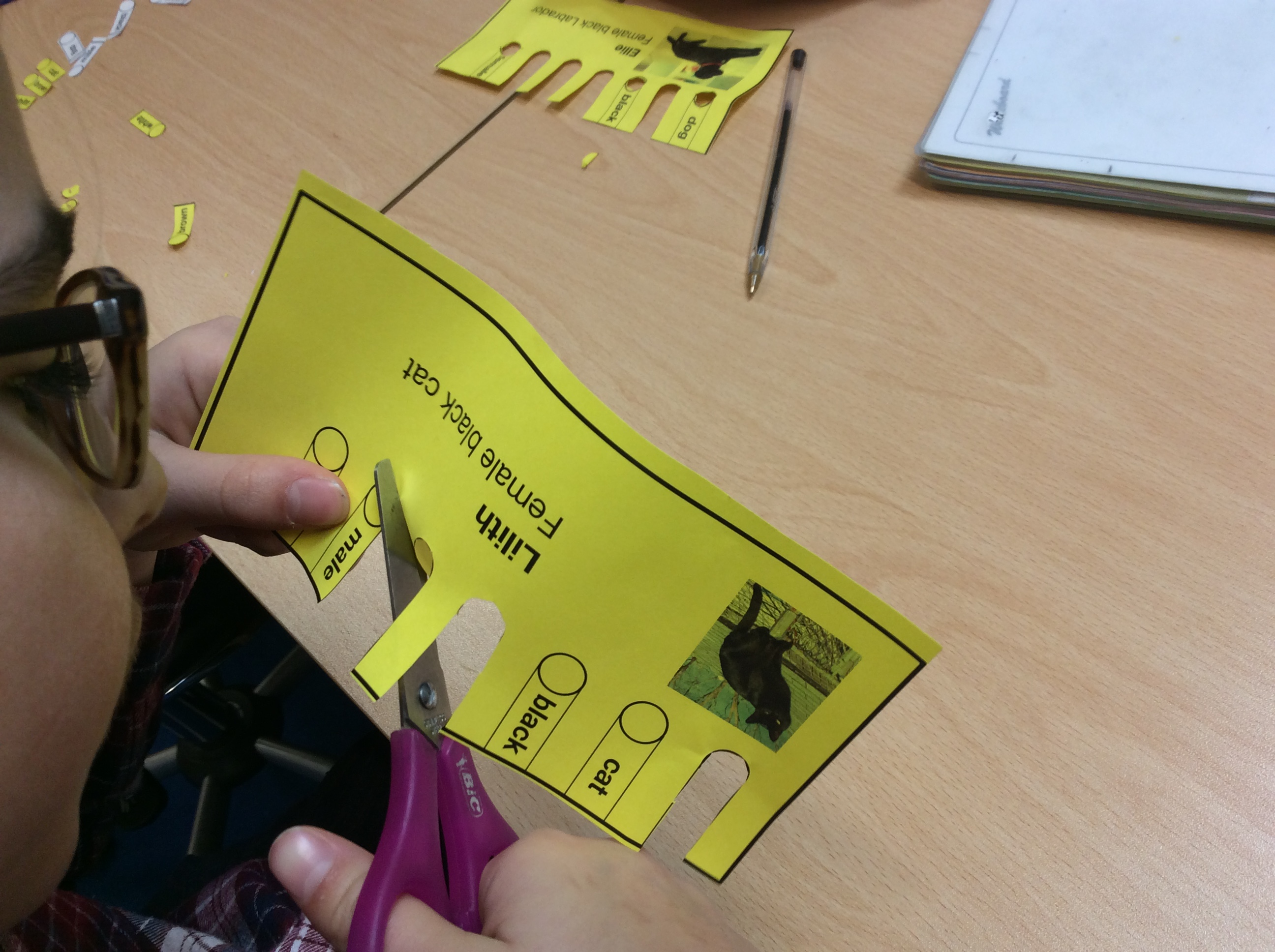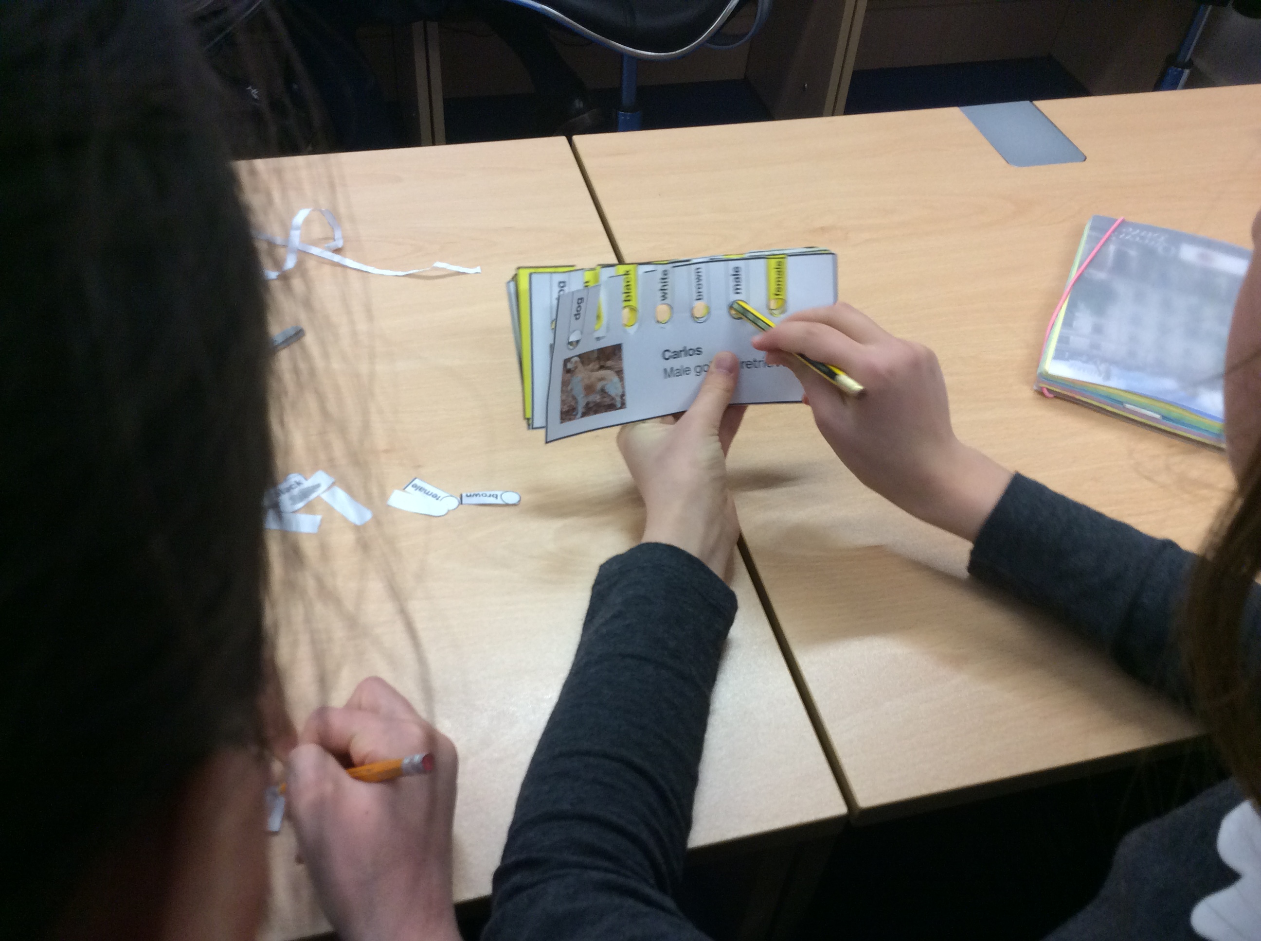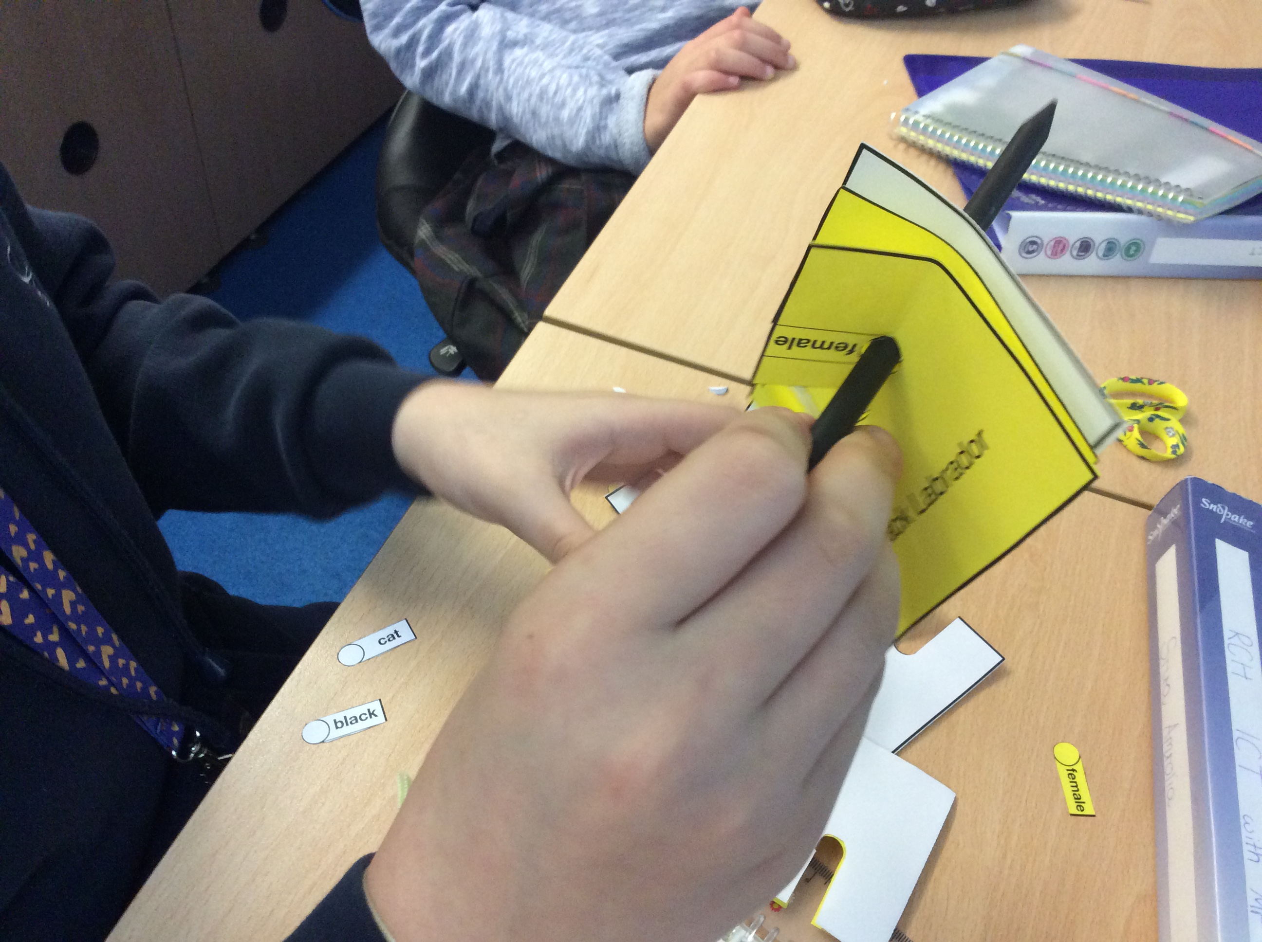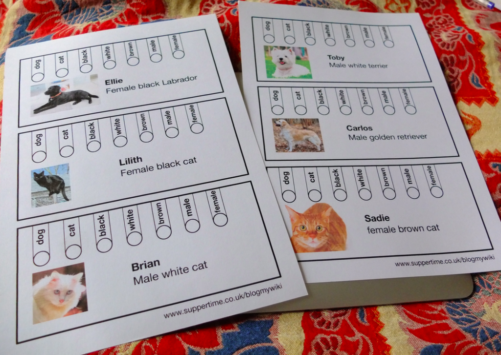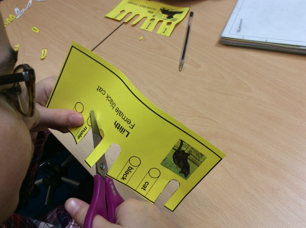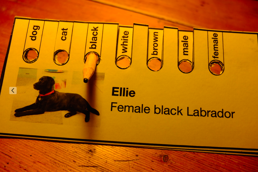 Of course I may want to select more than one property at a time, and I can do that with these cards. Say I want to sort out all the animals that are black AND female. Aha, I know, I’ll put a pencil in the black hole AND the female one. (It doesn’t matter what order the cards are stacked in).
