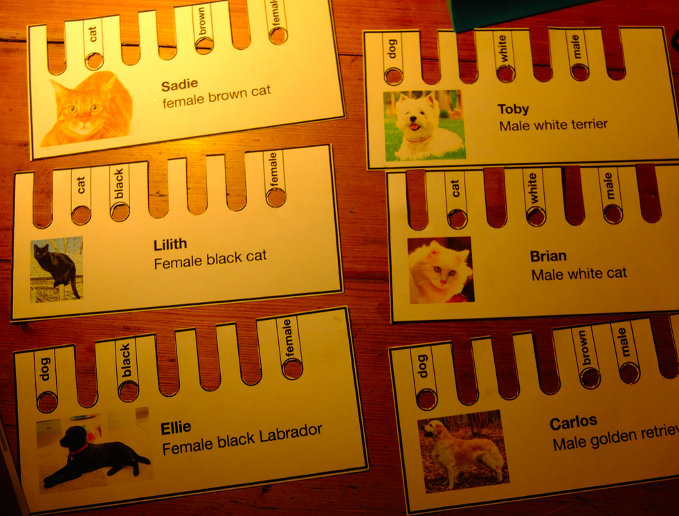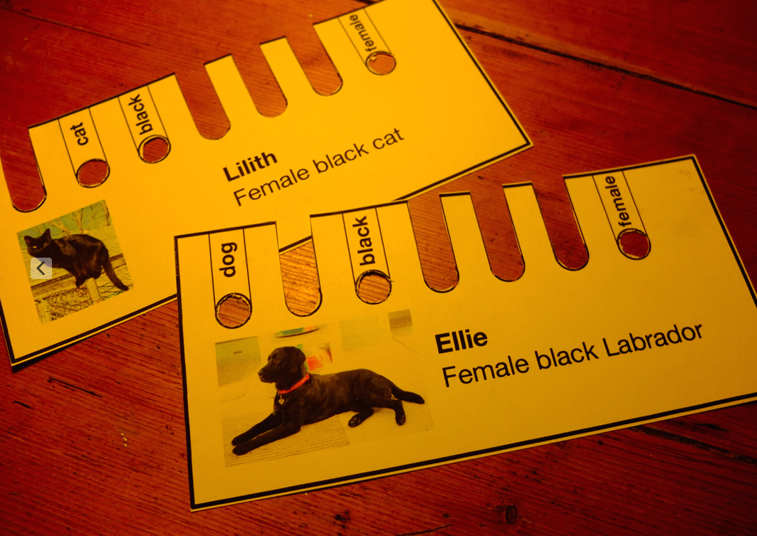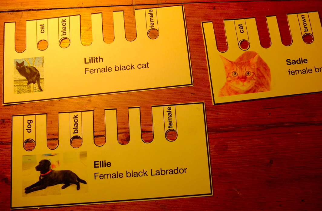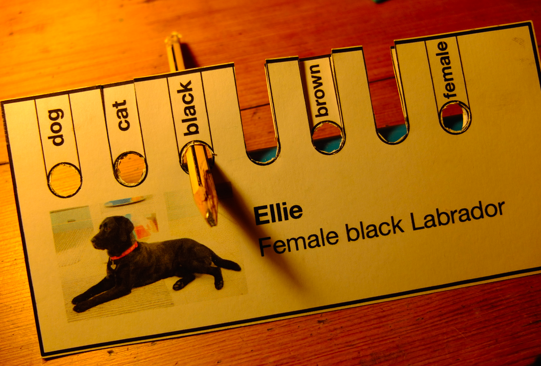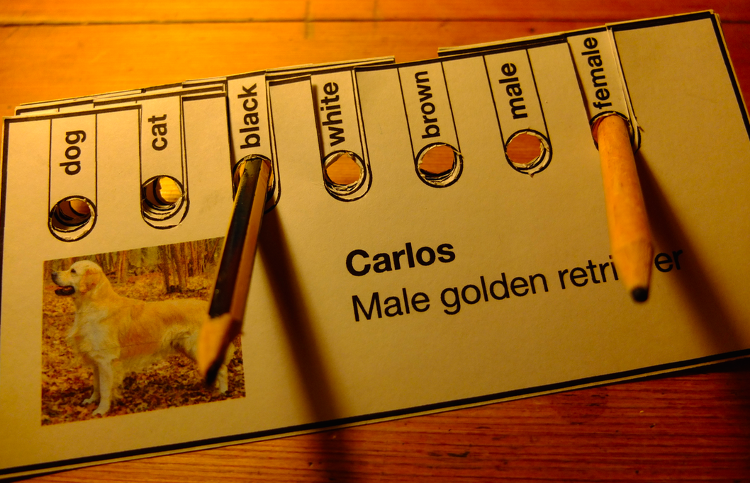 You have a stack of cards about cars, people, or in my case pets. You encode their properties using either a punched hole or a slot. For example my pet is a dog, black and female, so I snip out all the other labels and leave holes for dog, black and female.