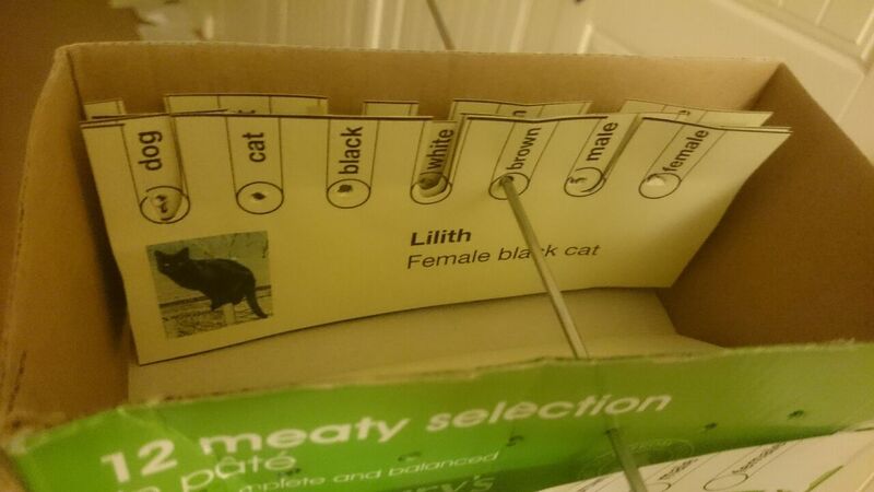 As well as the cards, they constructed a dispenser from an old cereal box. The cards were stacked at the top on a pull out platform which lined them up with holes through which knitting needles could be threaded. The bottom of the box was cut to form a hatch with a slope. When the platform was pulled out, the rejected cards fell down the slope and out of the hatch. I constructed one as soon as the programme finished along with a whole load of animal related index cards. I loved it and I am certain it was one of the reasons that led me to a career in software engineering.