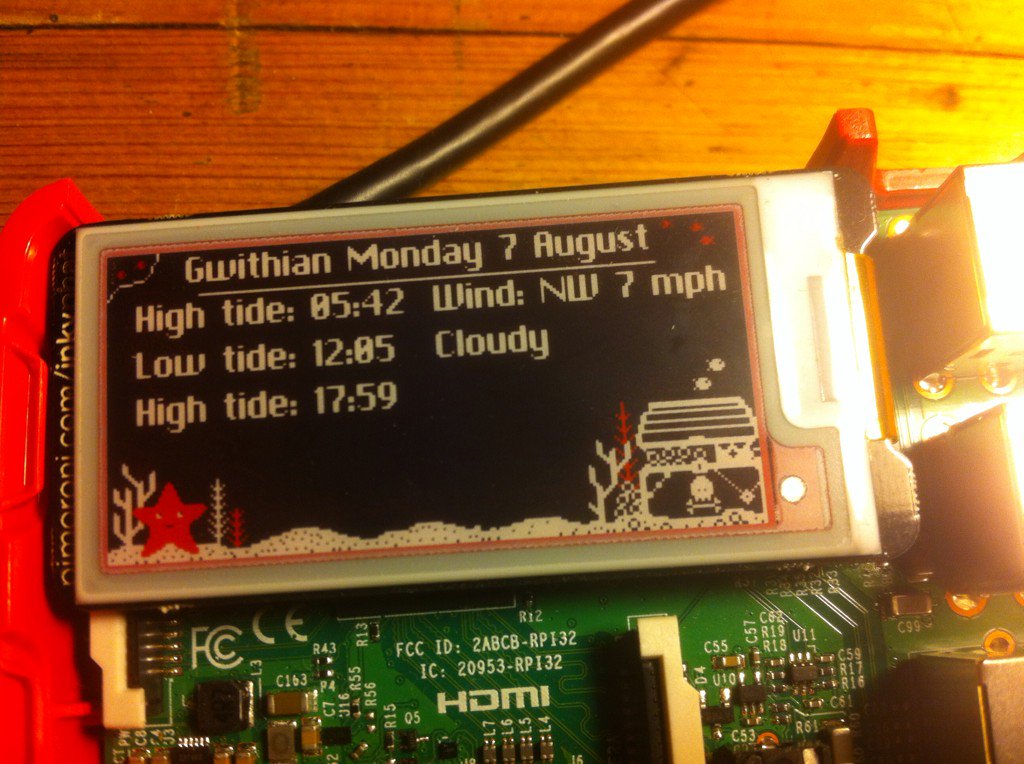 Nice post! Tide times are coming to home-assistant soon so if you could get the inky working with home-assistant (https://home-assistant.io/) you could display tides or any other data source available. This is a project on my to-do list actually!
