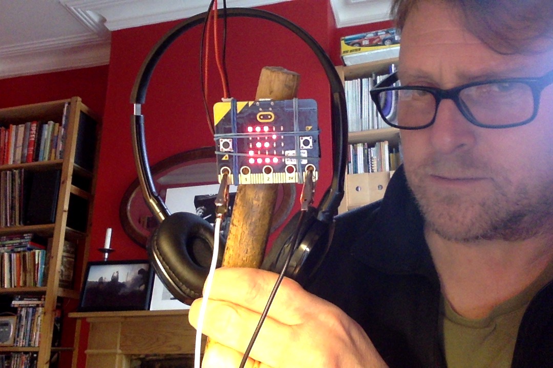 Attach a micro:bit speaker to the GND and 0 pins. CAUTION: if you attach normal headphones DO NOT WEAR THEM, just put them round your neck just like Lance and Andy in the photo at the top of this page – the sound is very loud. Or put a 3K ohm resistor between pin 0 and the headphones.. You could have some fun making a ‘metal detector’ as I did in the picture above with an old broom handle and some rubber bands.