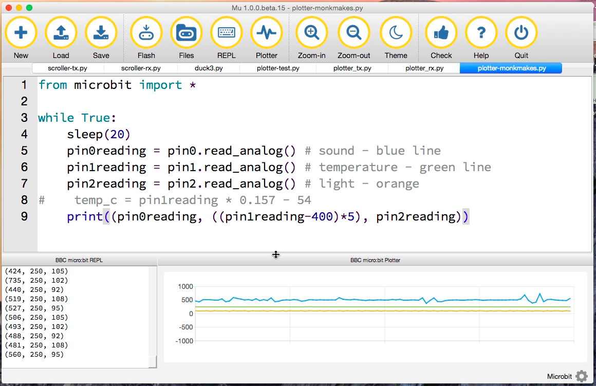 Here’s the Python program I used. I opened the REPL and plotter in Mu and then flashed this code onto a micro:bit with the sound, temperature and light sensors attached to pins 0, 1 and 2 respectively: