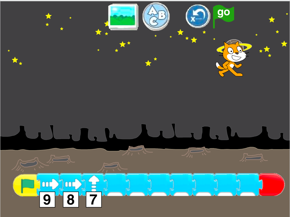 Have a play, let me know what you think. It could be a useful introduction to ScratchJr, especially if tablets aren’t always available. You could also use it with children who have already used ScratchJr as an assessment tool: choose a background with a particular goal (planet, castle, end of the road) and ask the class to program their sprites to reach it. The limited set of blocks and options would stop children going too far off-task (which I find can be a problem with both the most and least-able children!).