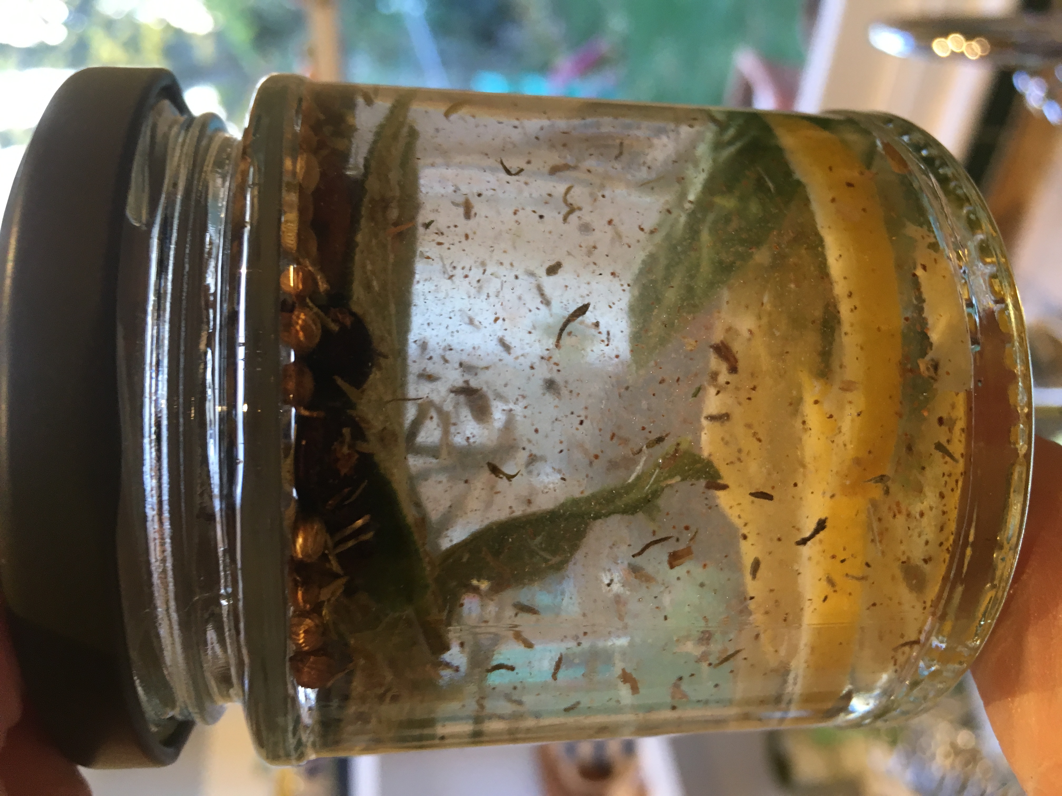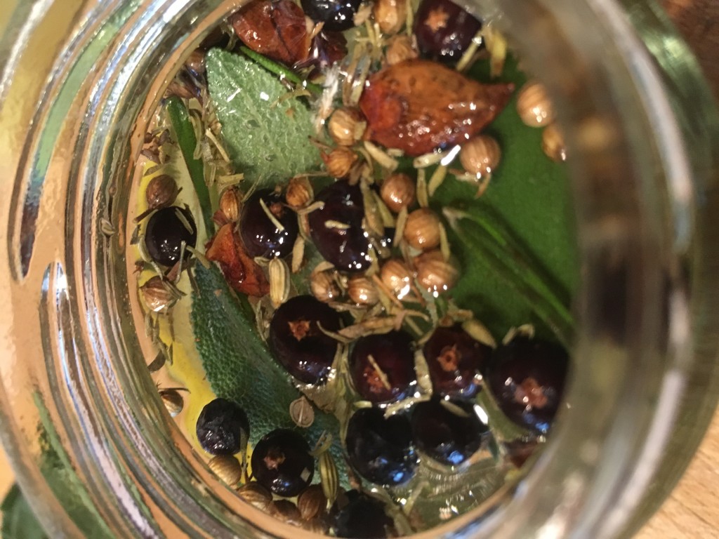 Now I’m having a go at making my own gin-like drink. No idea if this is going to work, but the plan is this: I filled a small jar with vodka and added the ingredients listed below. It already smells like gin! I’m hoping that the longer I leave it, the more intense the flavours will be and hence the more I will be able to dilute the resulting ‘tea’ with plain vodka to make it go further.