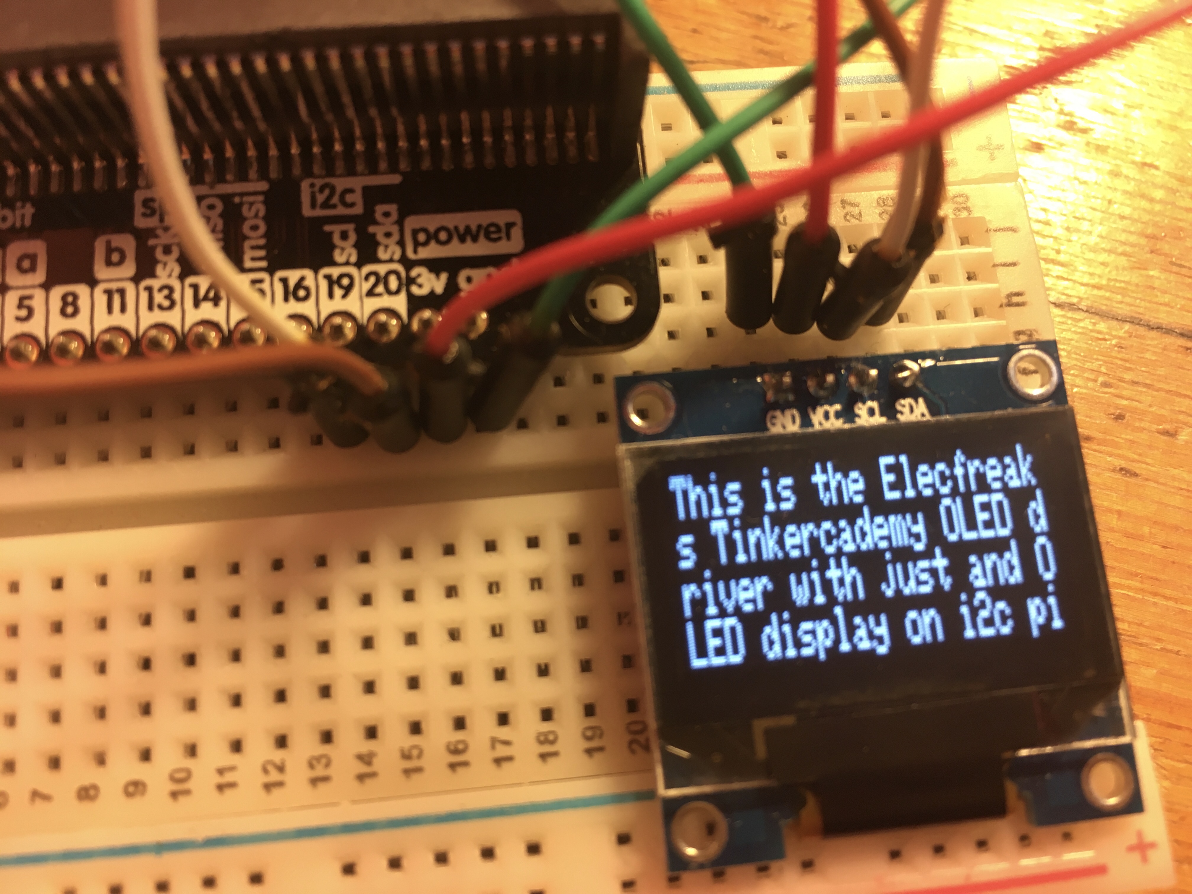 There’s another MakeCode OLED extension from Elecfreaks for their Tinkercademy board and kit, which I discovered works fine without their board and just an SSD1306 OLED connected straight to the micro:bit’s i2c pins. It’s also very limited, just allowing the display of text, numbers, lines, rectangles and a progress bar that I can’t get to work, but it does use a better font, tall and narrow (around 5×7 or 5×8 pixels with spacing) but much more readable than porting the micro:bit’s own 5×5 pixel font. It seems to double each row, even when drawing graphics, so I think the effective resolution with this extension is 128×16 pixels: