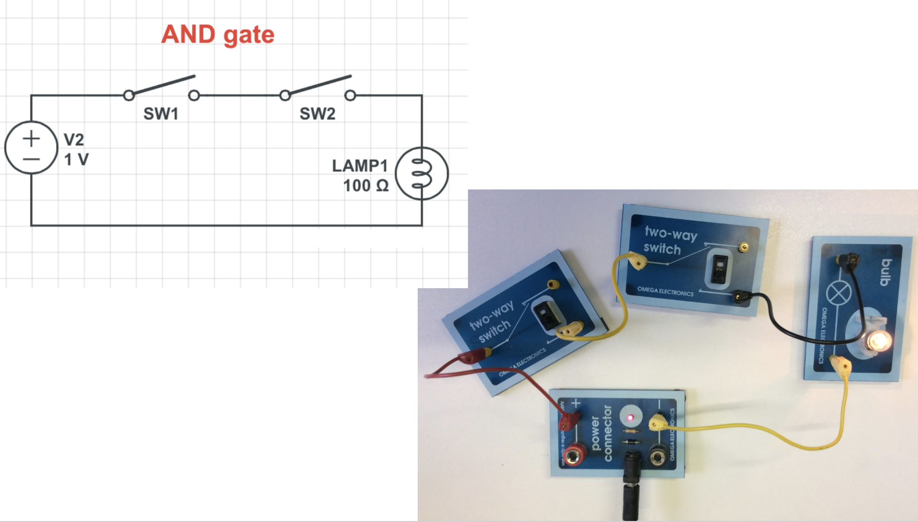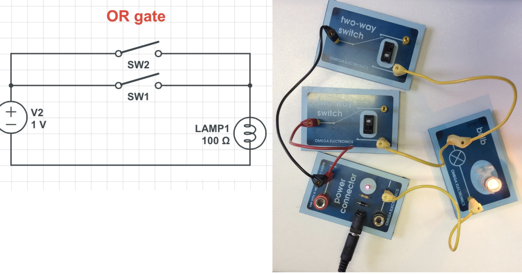If either switch A or B is, the sum light is lit, but not the carry – binary 01.