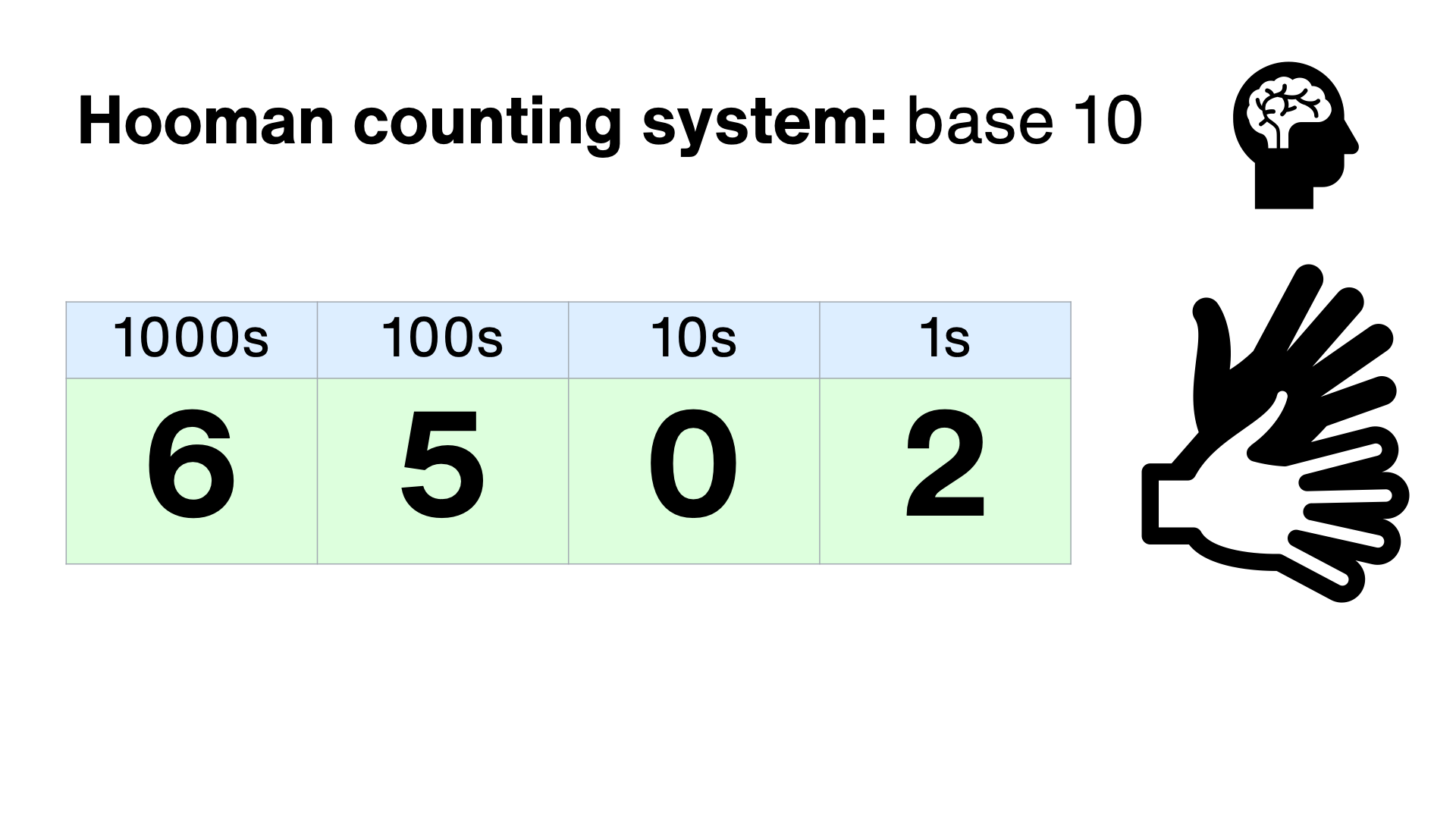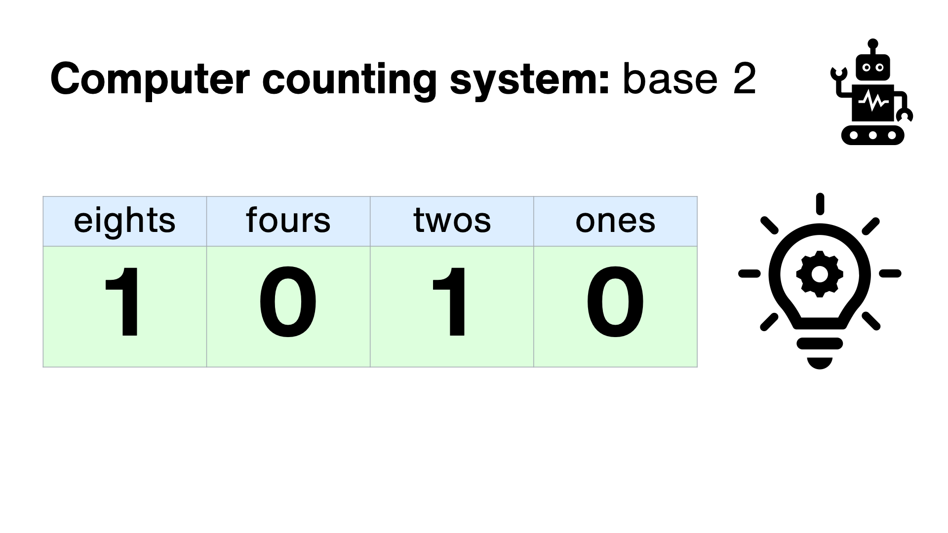 Humans usually count in a system based around the number 10 – because we have 10 fingers. We use 10 different symbols, 0 through to 9 to record numbers. Each column is worth 10 times more than the one to its right. This is called base 10, or denary.