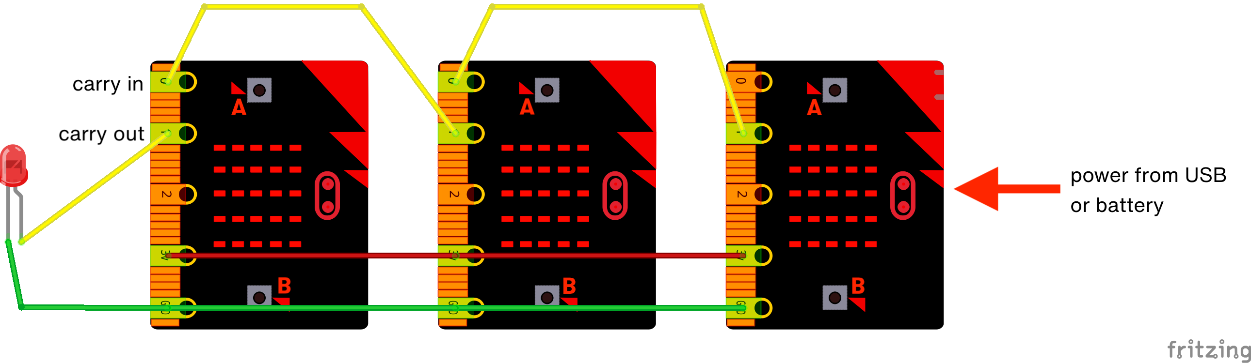 That leaves us with one carry out left over, no matter how many micro:bits we use. But we don’t need to let it go to waste! If you have an LED lying around, connect its long leg (the anode) to the final carry out, and its short leg to GND. While you’re there, connect all the GND pins together, to complete the electrical circuit.