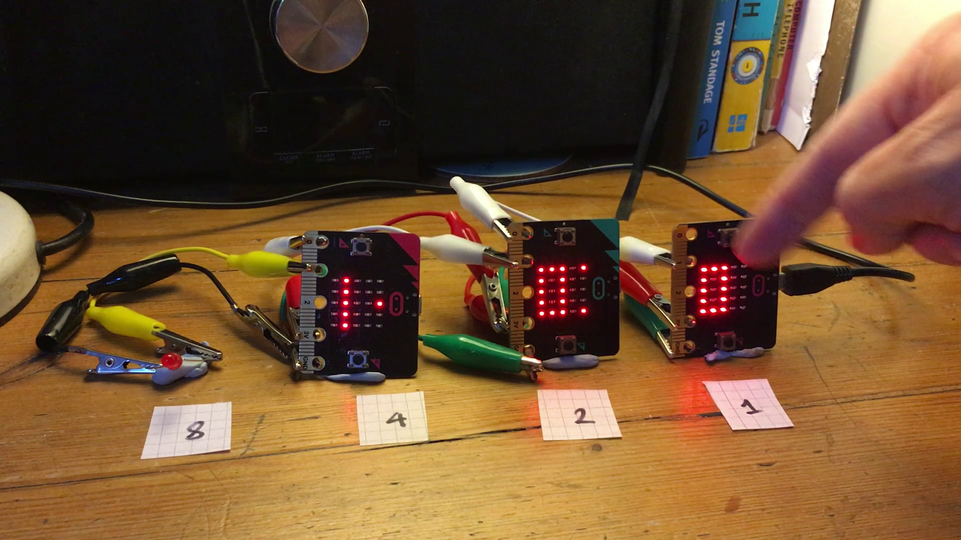 You’ll see another light has lit up on the micro:bit in the 2s column. That’s to show that it’s received the carry bit from its neighbour.