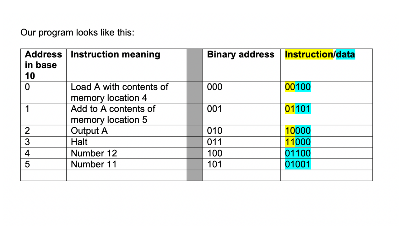 The middle row shows the contents of the memory at the address shown on the top row, again as a binary number. So here we see that memory location 00010 contains 10000.