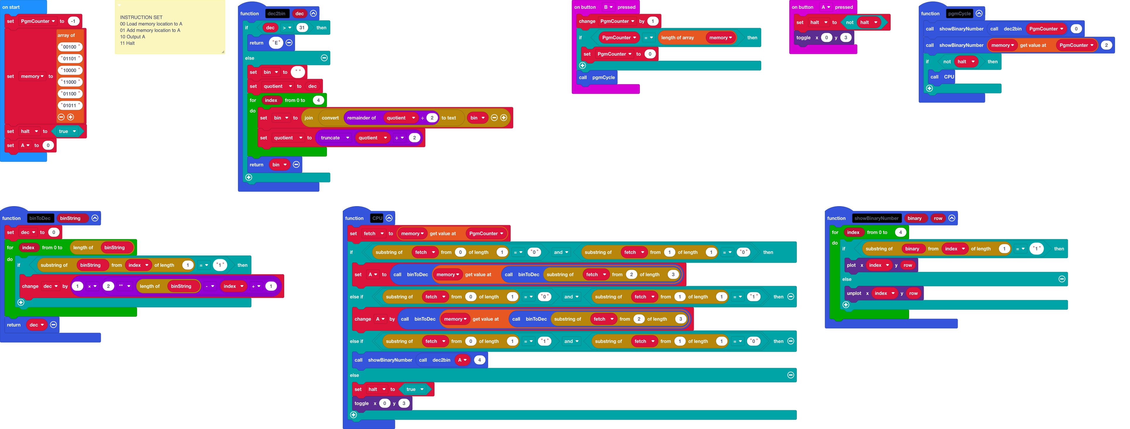 Here’s the function that converts from binary to base 10. The CPU function uses this to translate binary memory addresses and data into base 10 so we can use normal MakeCode maths functions and array addresses. Let’s unpack how this works.