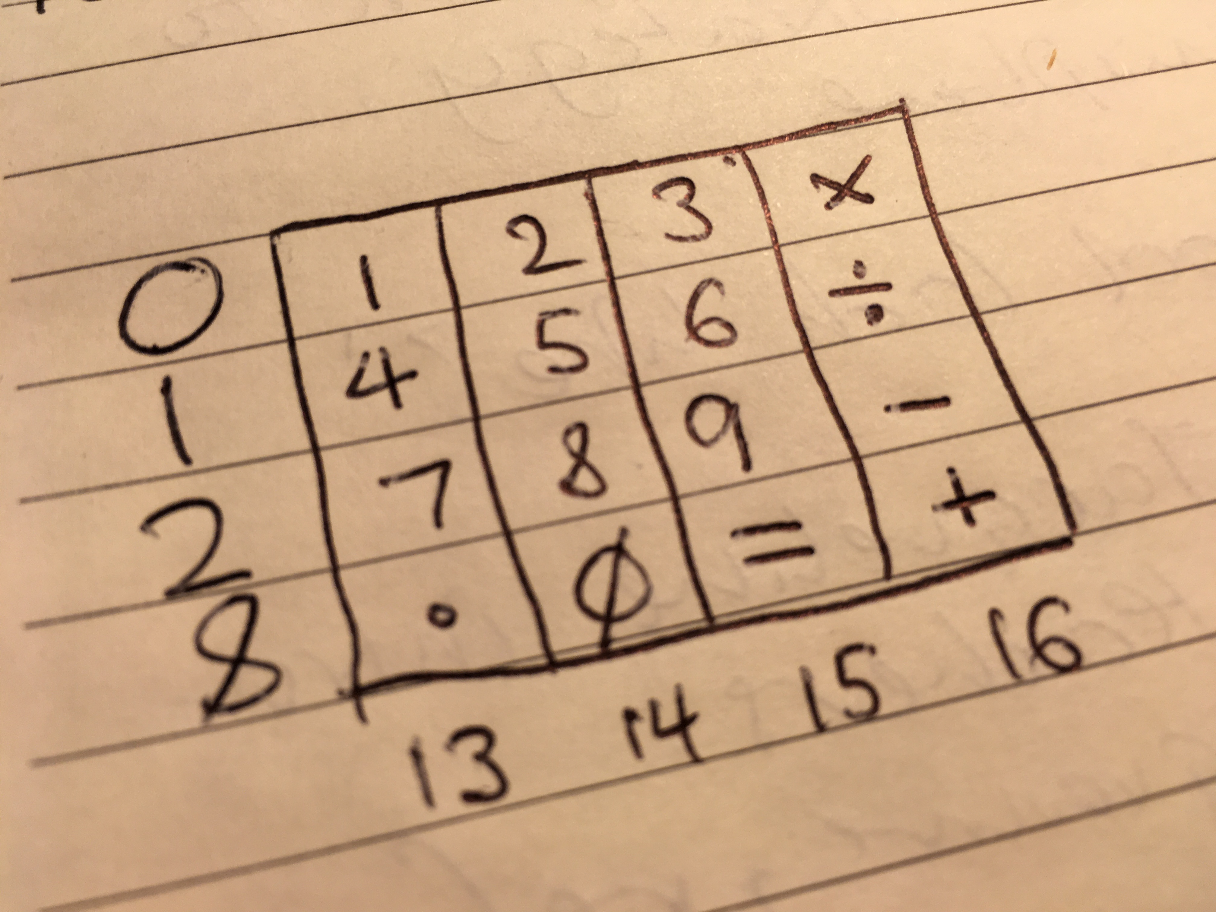 The keypad layout is not the same as a normal calculator, which has 7 8 9 in the top row, but it’ll do. I used the A B C D keys for the operators multiply, divide, subtract and add. I used the * button as decimal point and # as the equals key.