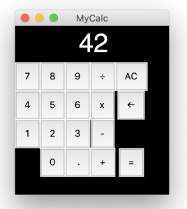 display is the area in which the numbers are displayed. I set the initial text to ’0′ and the text colour to white. You can specify fonts, but I decided to leave it to a default font and it looks ok on a Mac at least. The grid statement puts it in the second column with a stupidly large span of 15 columns and 1 row to prevent it moving the buttons too much when the numbers get long. This needs a bit of work as if you divide 22 by 7 the buttons do still spread out a bit.