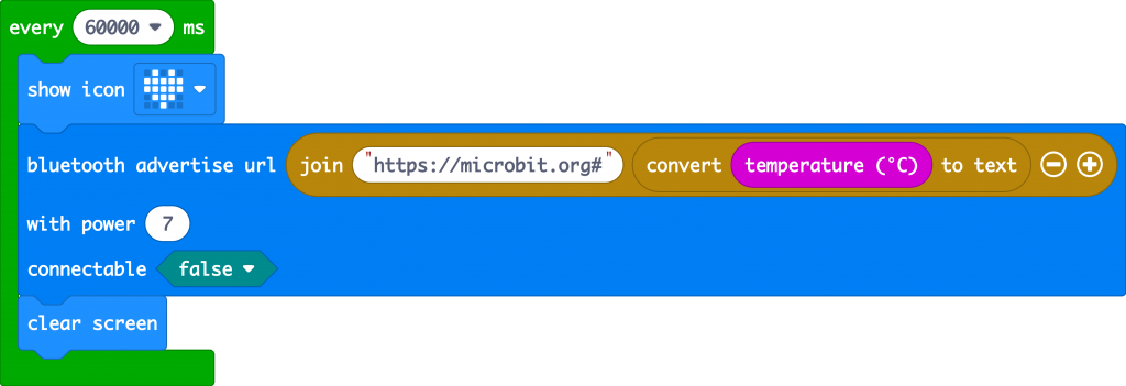 What this simplified project does is just send the current temperature from the micro:bit once a minute. A heart flashes on the LED display so you know it’s working.