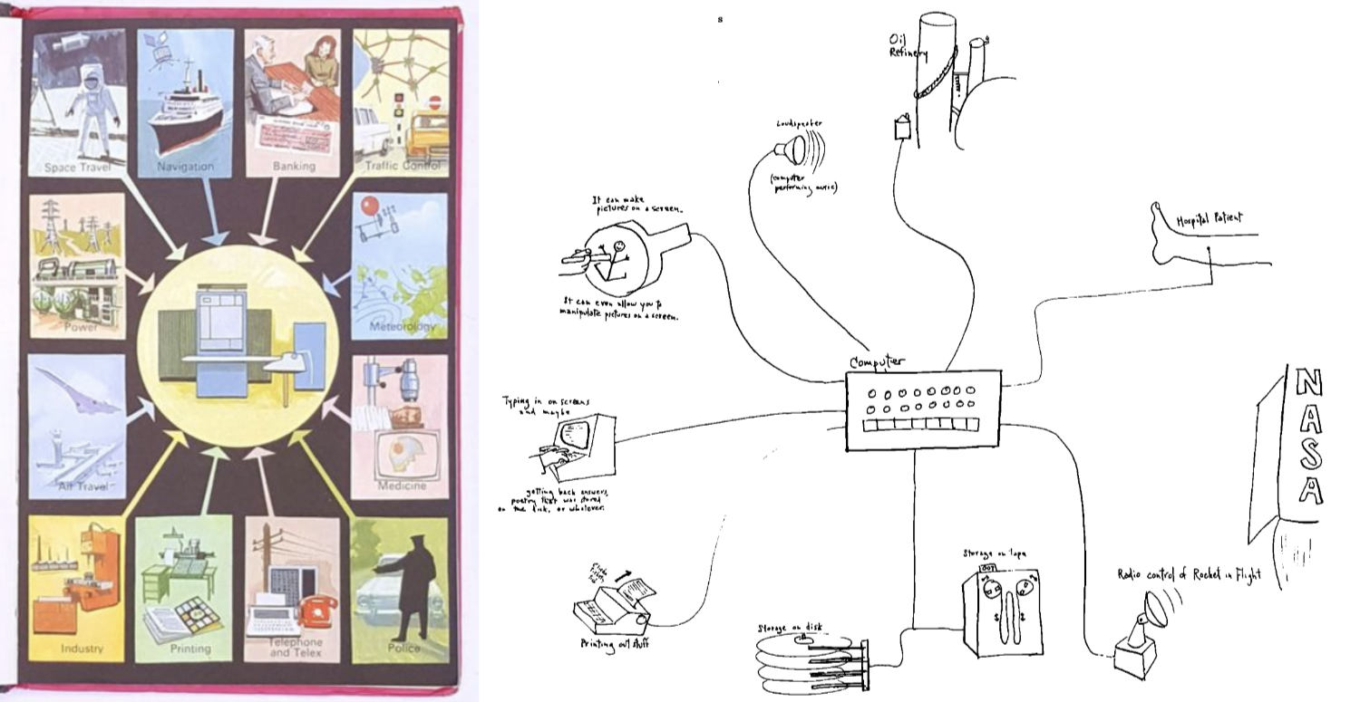 1971 Ladybird book on computers (left) and a diagram from Computer Lib (1974) that reminded me of it.